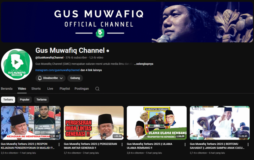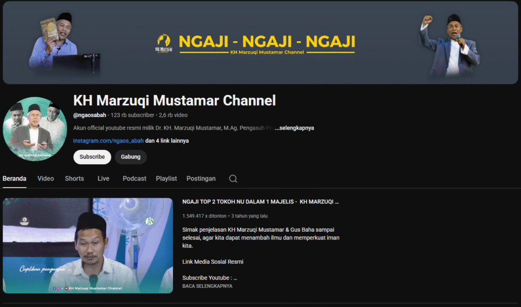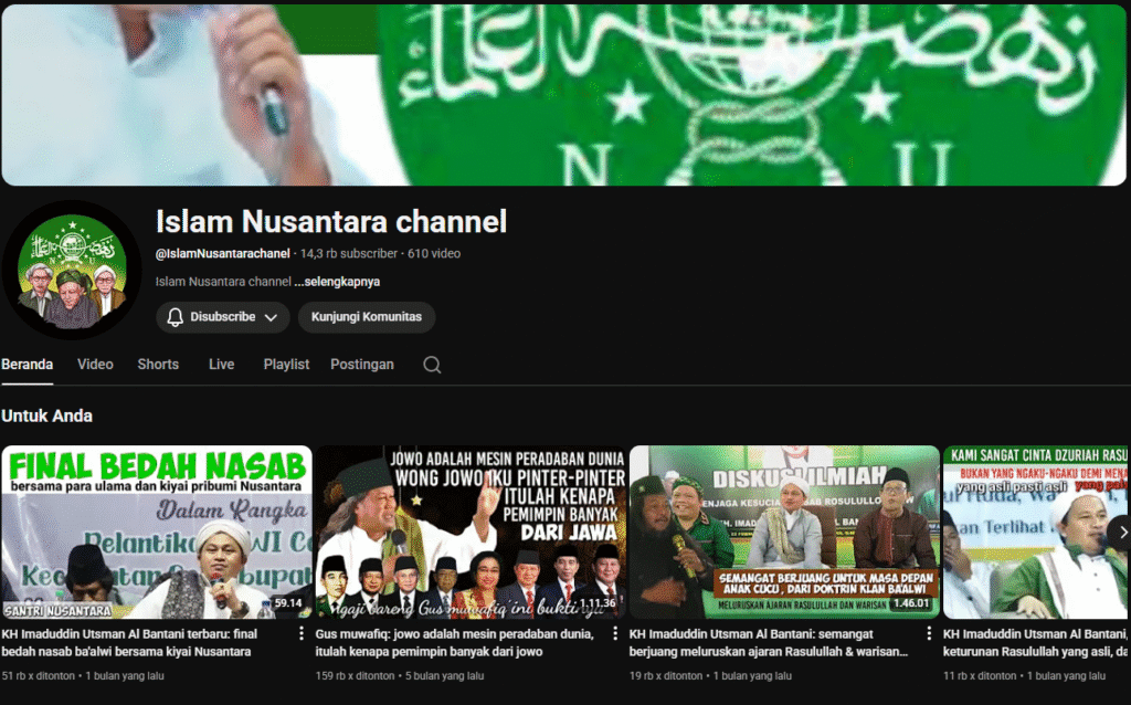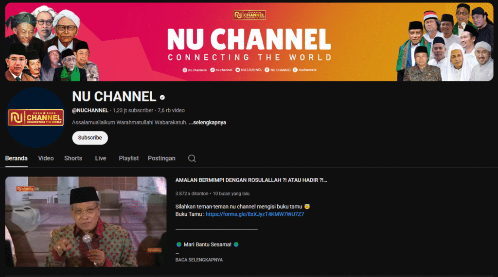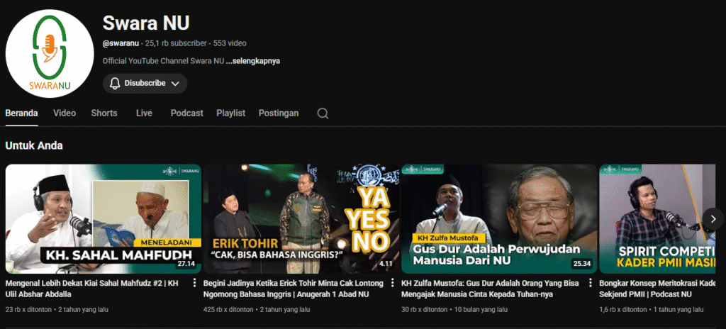 • Deskripsi: Kanal resmi Nahdlatul Ulama, fokus pada ceramah tokoh (KH Said Aqil Siradj, Gus Mus), respons isu aktual, bincang etika Islam Nusantara, hingga program Teras Kyai.