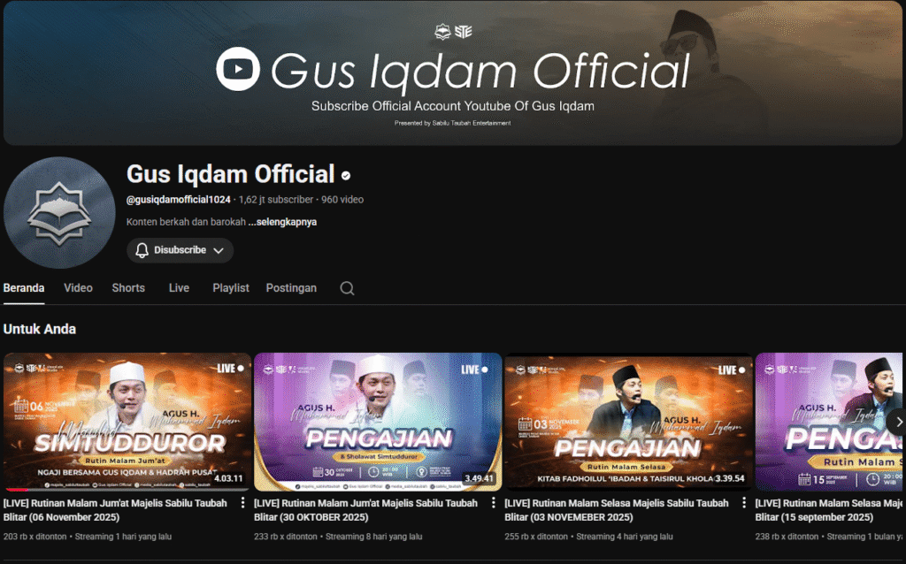• Deskripsi: Gus Iqdam Official – Saluran dakwah Islam terpercaya dengan pendekatan modern dan komunikatif. Menghadirkan pengajian umum, ceramah, dan kegiatan rutinan Majelis Ta’lim Sabilu Taubah. Lebih dari 1.58 juta pengikut mempercayai konten berkualitas kami. Bergabunglah dengan komunitas pembelajaran Islam kami.